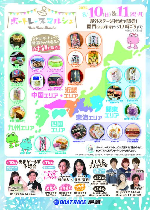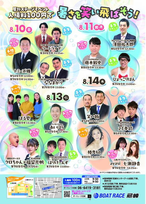 さて、開催中の本場では「ボートレース尼崎スペシャルサマー」と銘打ったイベントが行われ、連日、大人気の芸人・タレントが登場します。よしもとからは10日(日)にトミーズ雅、ツートライブ、ななまがり。11日(月・祝)に藤本敏史(FUJIWARA)、濱田祐太郎、ひょっこりはん。13日(水)にぼる塾、はりけ~んず、あいはら(メッセンジャー)。14日(木)に椿鬼奴、笑い飯、2丁拳銃。いずれのステージもボクがMCを務めさせていただきます。
