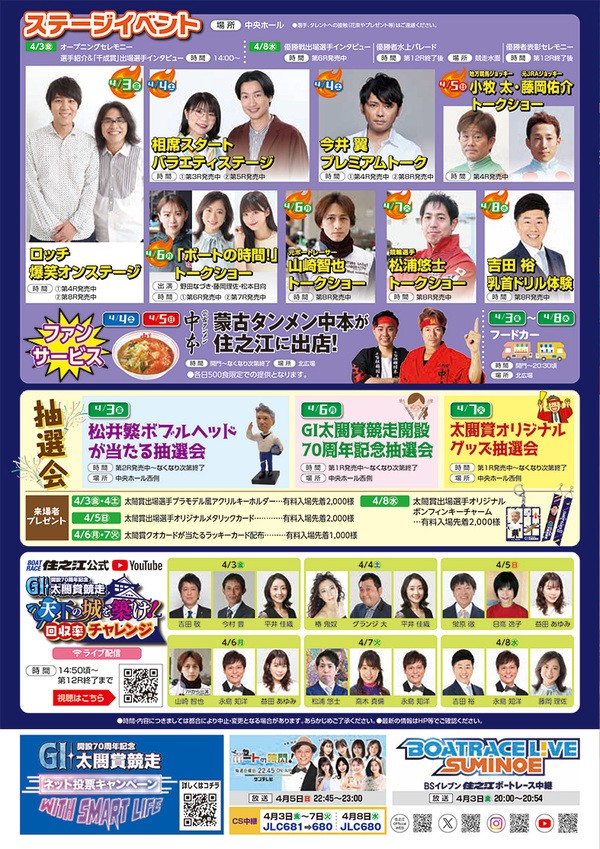 レース観戦とともに、豪華ゲストによるイベントや来場者プレゼント、グルメなどが楽しめるボートレース住之江。この機会にぜひご足を運んでみよう!